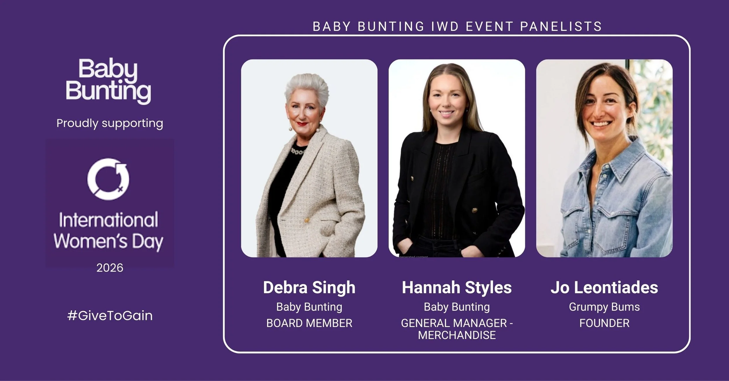 On Wednesday 4 March, team members tuned in live to our International Women’s Day Panel, hosted at our Store Support Centre. The discussion explored leadership, career journeys and the theme “Give To Gain”, featuring Baby Bunting Board Member, Debra Singh, General Manager of Merchandise, Hannah Styles, and Founder of Grumpy Bums, Jo Leontiades. Their insights encouraged teams to support one another, embrace opportunities and continue building an environment where women can thrive.